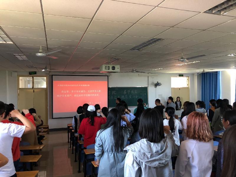 为了进一步加强毕业论文管理工作,强调毕业论文写作规范,严肃毕业论文撰写纪律,5月3日上午,我院召开毕业生学术道德与论文写作规范宣讲会,外国语学院2018届毕业生出席了此次宣讲会。宣讲会上,全体毕业生共同宣誓“坚守学术诚信,完善学术人格,维护学术尊严,做优良科学道德的传承者”。
