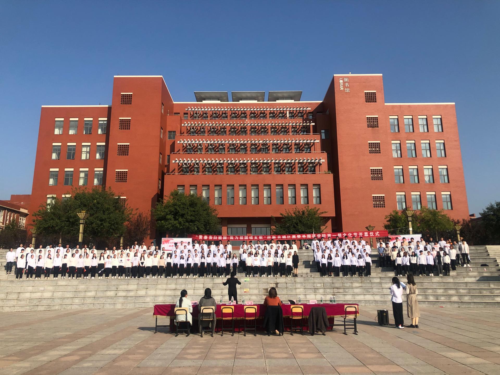 10月7日下午,外国语学院在长清校区湖畔广场举办“青春告白祖国,我为祖国唱支歌”迎新合唱比赛暨第一届文化节开幕式。学院主要负责人、全体辅导员、班主任代表及2020级全体新生参加了活动。