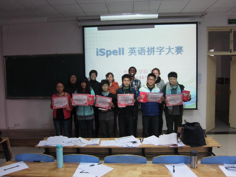 为响应外国语学院提高教学质量,重视教学过程管理的号召,11月19日下午,外国语学院负责管理学院,财经学院和交通法学院的大学英语教学团队的黄玉倩,刘景琳和李桂平老师组织的iSpell英语拼字大赛在长清校区如期举行。本次比赛共有12个班级,72名学生参加,大学英语教学部主任隋志娟老师和两名美籍教师担任了评判工作。经过团体赛和个人赛紧张激烈的争夺,最终管理144,金融141,电商141三个班级夺得团体奖,六位同学荣获个人奖,其中管理144班胡晞同学获个人赛冠军。