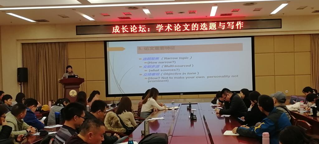 11月28日下午,山东大学外国语学院院长王俊菊教授做客我校“成长论坛”,在学术报告厅会议室作了题为“学术论文的选题与写作”的学术讲座。