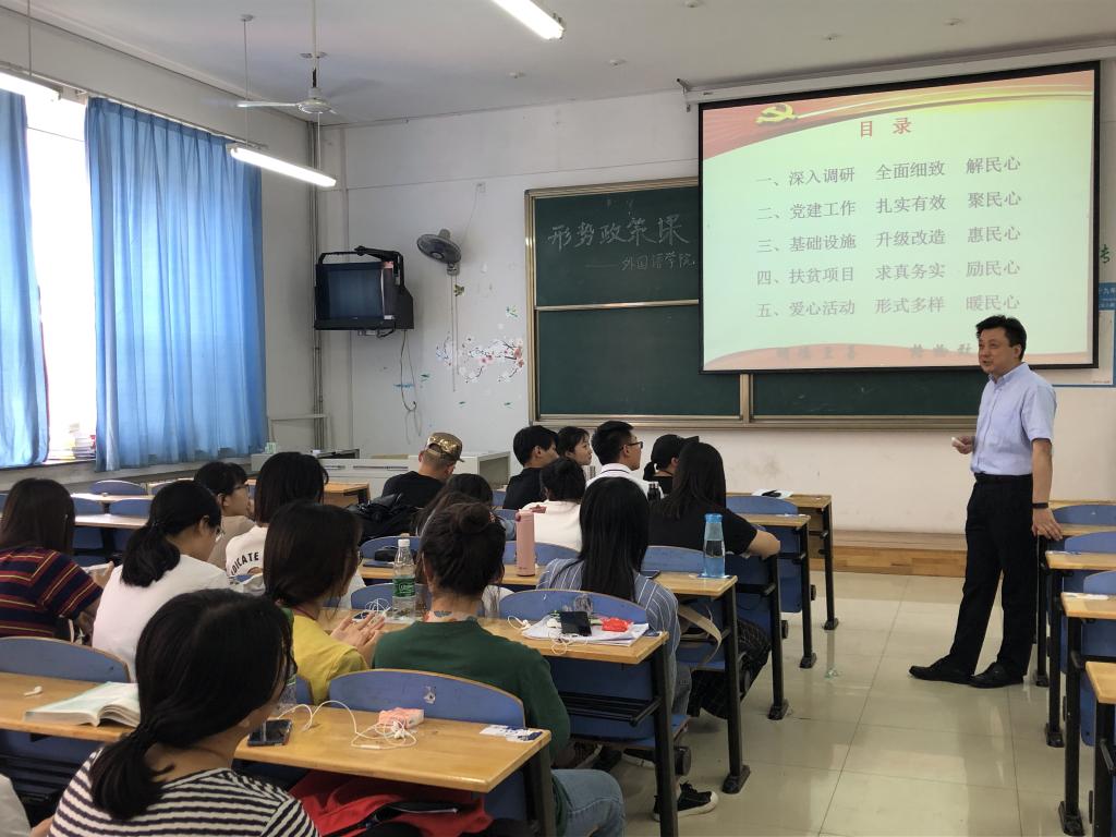 5月27日下午,外国语学院分党委书记、马克思主义学院《形势与政策》课校内特聘兼职教师马昭同志在2A303为外国语学院部分学生上了一堂《形势与政策》课。