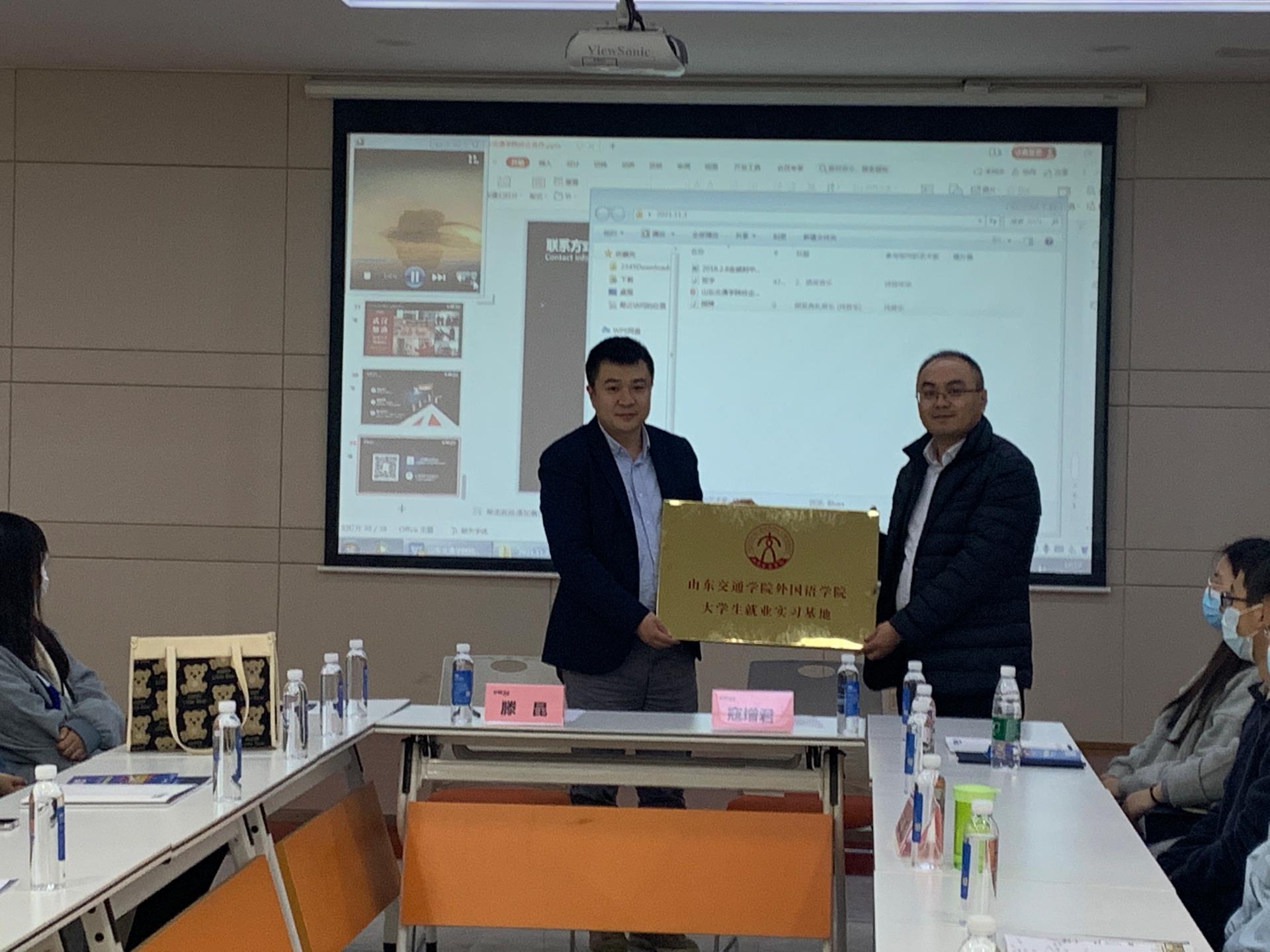 11月3日,外国语学院与济南金威刻科技发展有限公司签订大学生就业实习基地协议。济南金威刻科技发展有限公司负责人出席了签约仪式,外国语学院团委书记滕昆以及40余名学生代表参加了活动。