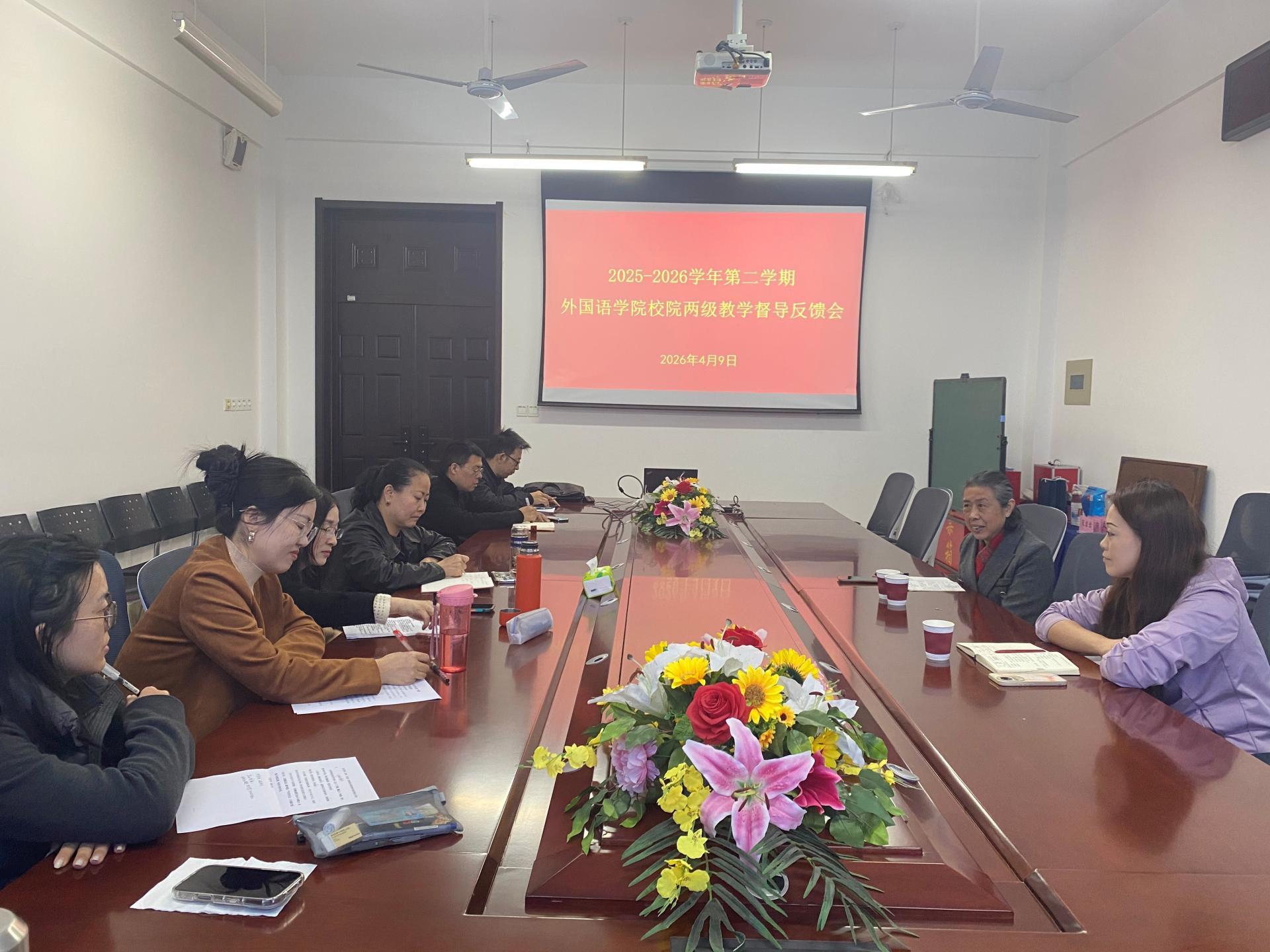 4月9日,外国语学院在2A310会议室召开2025-2026学年第二学期校院两级教学督导反馈会。校级教学督导曾梅、吴丽,学院院长宋岩岩出席会议,各系部负责人、院部督导代表参会,会议由宋岩岩主持。
