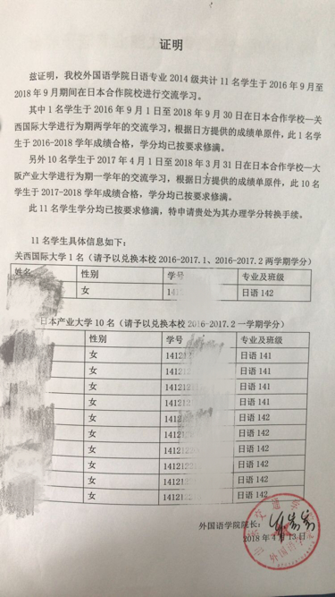 12名同学中有1位赴关西国际大学留学2年,另有10位赴大阪产业大学分别留学2年、1年,1位同学赴大阪那产业大学留学半年。12名同学现已顺利完成在国外的学业,其中11名同学需要在我校进行学分兑换。同学们的国外成绩单已由我校外事处审批,接下来将报备教务处进行兑换,兑换完成后即达到了我校毕业生的毕业学分要求。